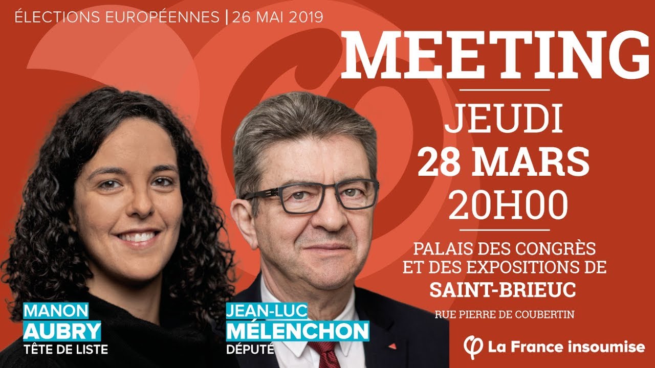 Pour le meeting à Saint-Brieuc, ce dernier se déroulera en présence de Manon Aubry, tête de liste aux élections européennes et de Jean-Luc Mélenchon, le 28 mars 2019 à 19 h 30 au Palais des Congrès et des Expositions, rue Pierre de Coubertin, 22000 Saint-Brieuc.