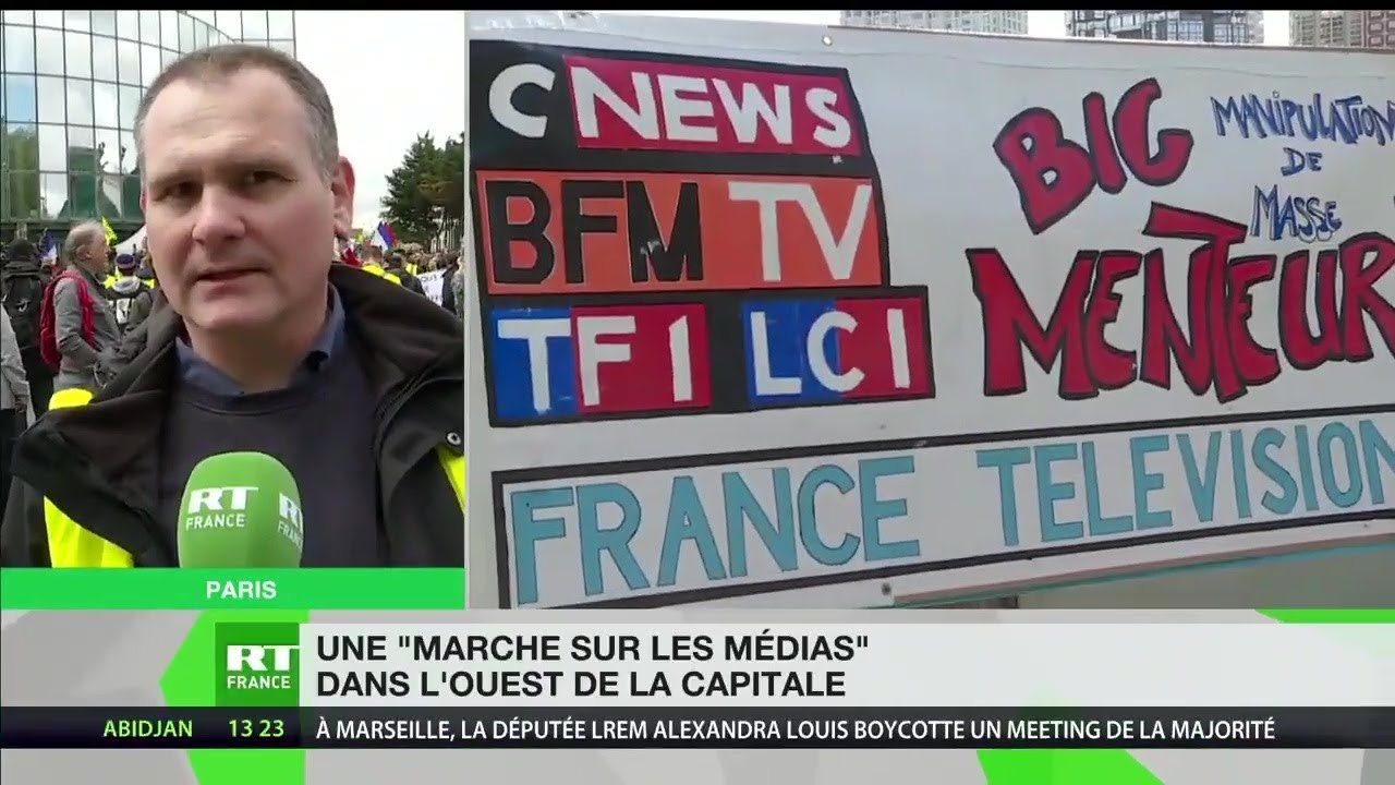 Des Gilets Jaunes justifient la manifestation contre la presse mainstream par leurs manipulations : «Comme d’habitude,ils n’arrêtent pas de nous diffamer, traiter d’homophobes, racistes, antisémites. Ils filment les mauvais moments et les diffusent dans le monde entier.»