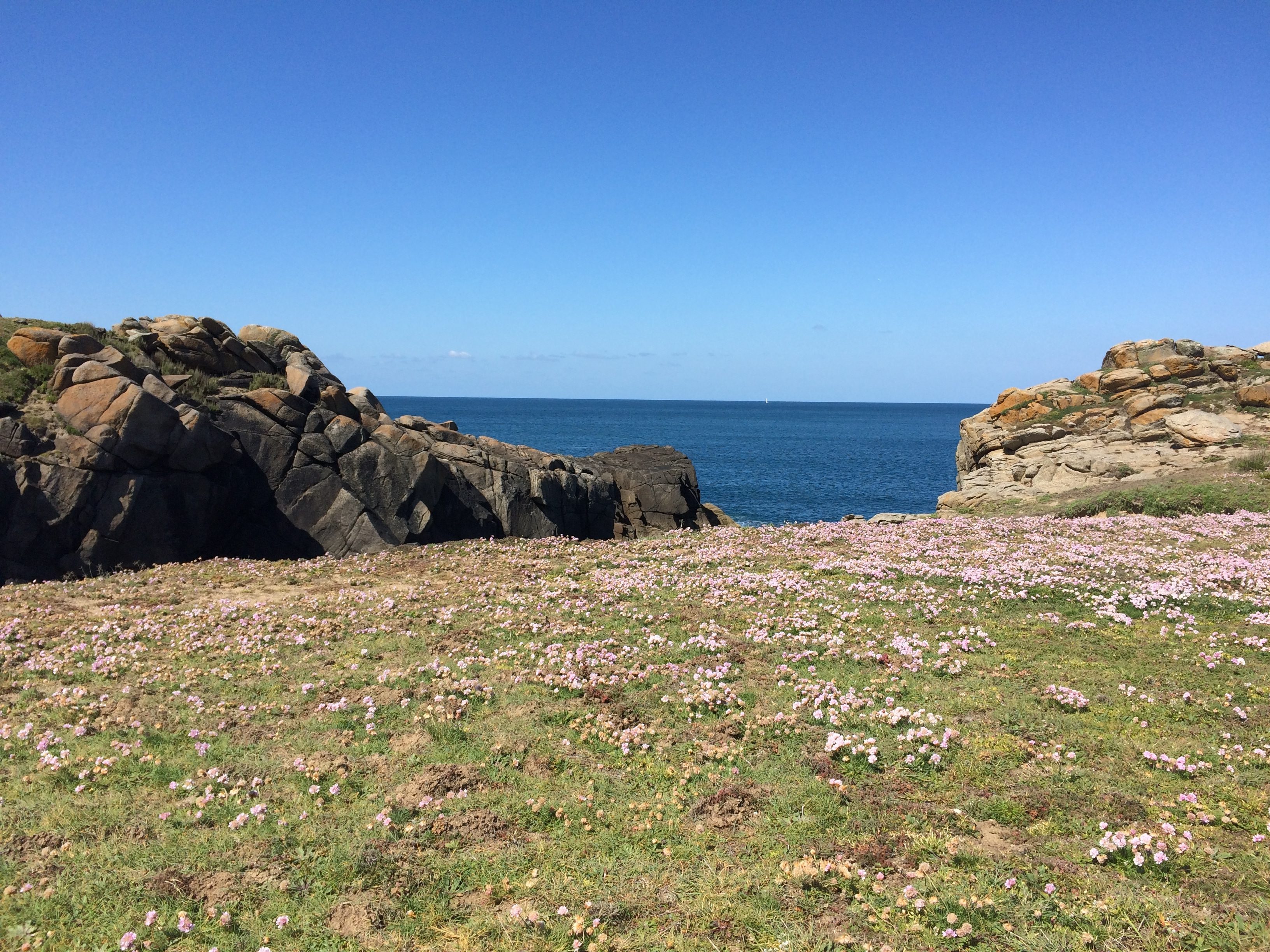 Ainsi équipés de nos deux-roues et munis d’un plan, l’exploration de l’île peut commencer. Ne pas s’étonner si Yves Montand vient parfois chanter dans nos oreilles « quand on partait de bon matin, quand on partait sur les chemins, à bicyclette », il est assez à-propos. Quitter le village en roulant sur les petites routes bordant d’adorables maisons blanches, aux portes et volets de bois peint de bleus ou de verts, est assez enthousiasmant. Il s’en faut de peu que l’imagination ne s’échappe un instant en Grèce. Les premiers champs d’ajoncs mêlés de chèvrefeuille sauvage auront tôt fait de la ramener en terres bretonnes. Petites routes en sous-bois, pistes sableuses sous les pins parasols, sentiers de randonnées sinuant sur la lande, les paysages sont variés, et l’océan se découvre par-delà les rochers de granit si caractéristiques de nos côtes atlantiques.