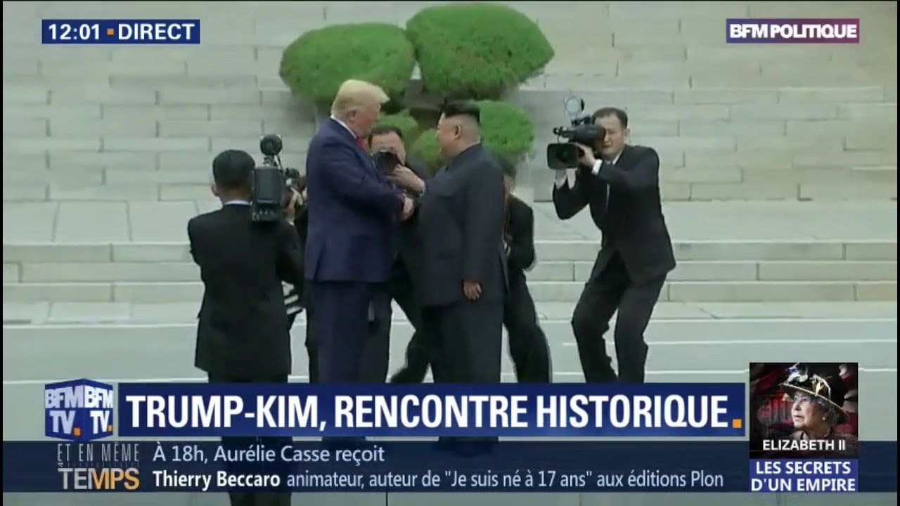 Le président américain Donald Trump est entré à pied en Corée du Nord ce dimanche, pour quelques pas historiques avec le dirigeant de ce pays, Kim Jong Un. Le chef de la Maison Blanche a franchi la limite qui marque la séparation entre les deux Corées dans le village de Panmunjom, où a été signé l’armistice de 1953. Jamais aucun président américain avant lui n’avait foulé le sol de la Corée du Nord.