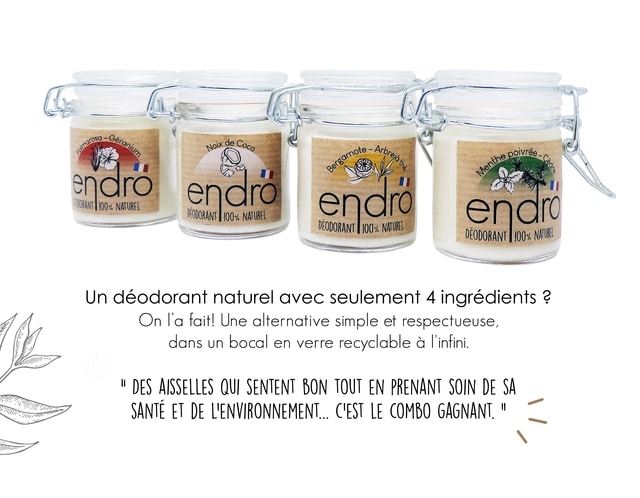 Les déodorants sont souvent incriminés pour leurs ingrédients chimiques et nocifs pour la peau. Un couple de jeunes entrepreneurs bretons a décidé de créer sa propre marque de cosmétique, 100% d’origine naturelle pour contrer ce problème. Avec Endro, Boris Le Goffic et Marion Le Goualher ont imaginé un déodorant naturel et écologique. Son contenu est 100% organique : des huiles essentielles et des ingrédients naturels tels que l’huile de coco bio, la fécule de maïs bio, la cire de carnauba bio et le bicarbonate de sodium. 4 parfums sont déjà disponibles : Palmarosa-Géranium, Bergamote-Arbre à thé, Menthe Poivrée-Cèdre et Noix de Coco.