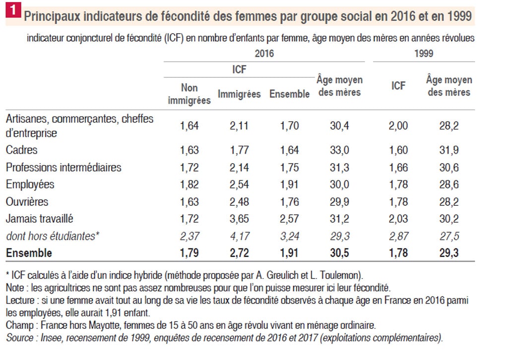 D’un point de vue socioprofessionnel, le document, réalisé à partir d’une analyse des chiffres recueillis sur l’année 2016, nous indique que les femmes cadres sont celles qui ont généralement le moins d’enfants. Avec un ICF (indice conjoncturel de fécondité) de 1,64, elles ont tendance à moins procréer que les employées (1,91). Ces dernières seraient donc les plus fécondes d’après l’INSEE, devant les ouvrières (1,76), les professions intermédiaires (1,75) ou encore les artisanes, commerçantes et cheffes d’entreprise (1,70).