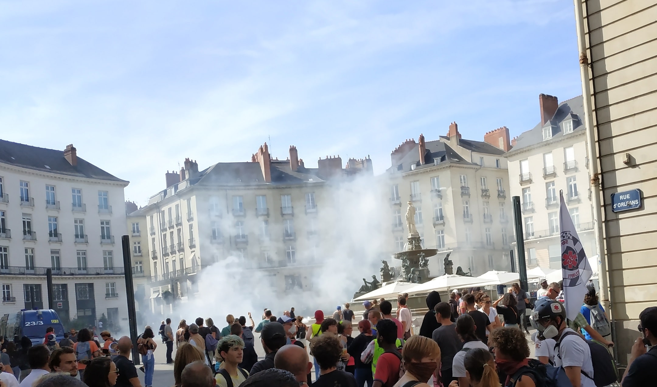 Au moins un cocktail Molotov a été balancé sur la police. Par ailleurs, un gradé gendarme mobile a été aspergé de peinture rose dans le Bouffay – ce qui lui a valu d’être copieusement moqué… par ses collègues, et un motard de la police s’est fait voler la clé de son engin alors qu’il remontait la manifestation. Il a réussi à le ramener à bon port.