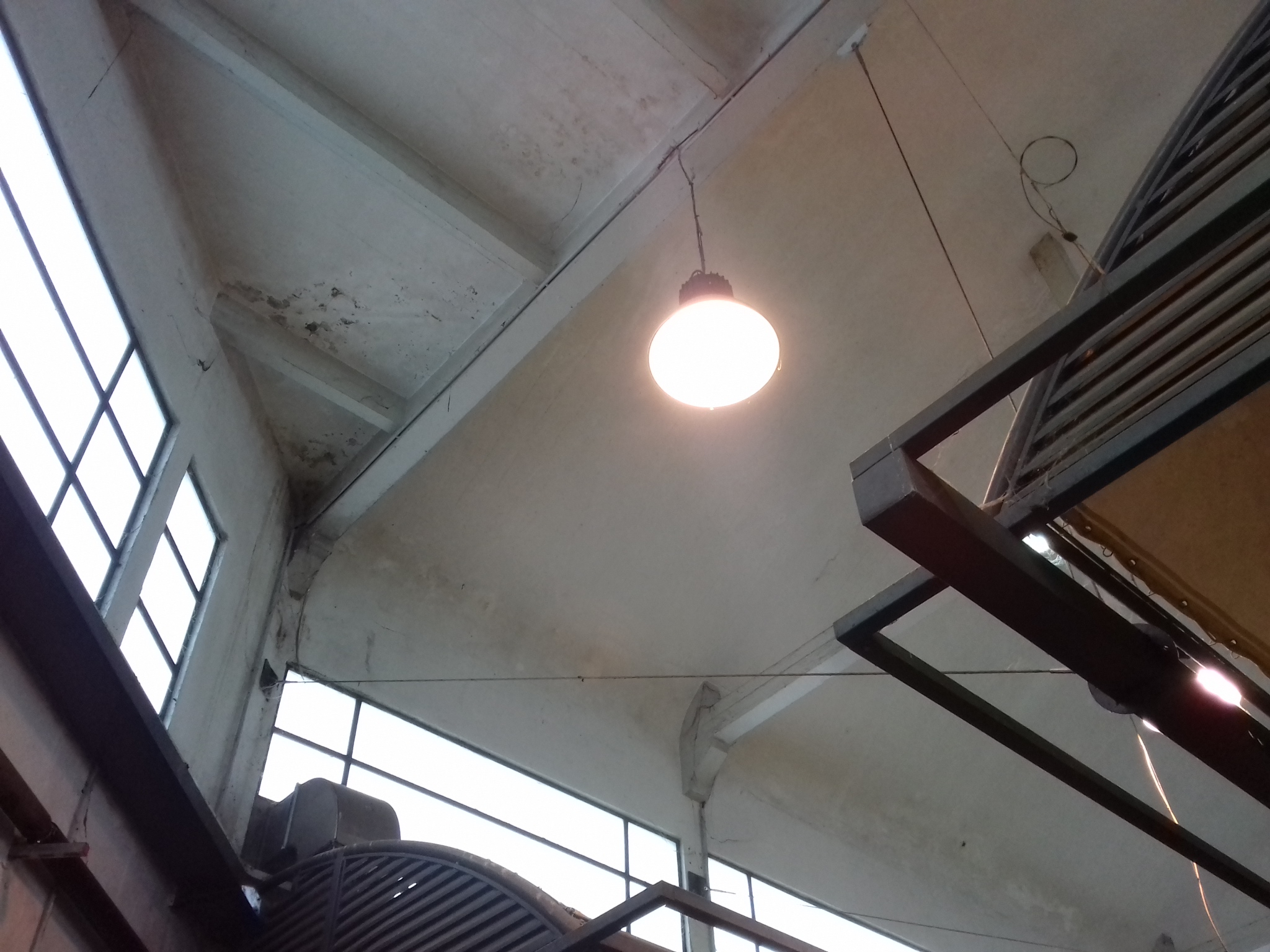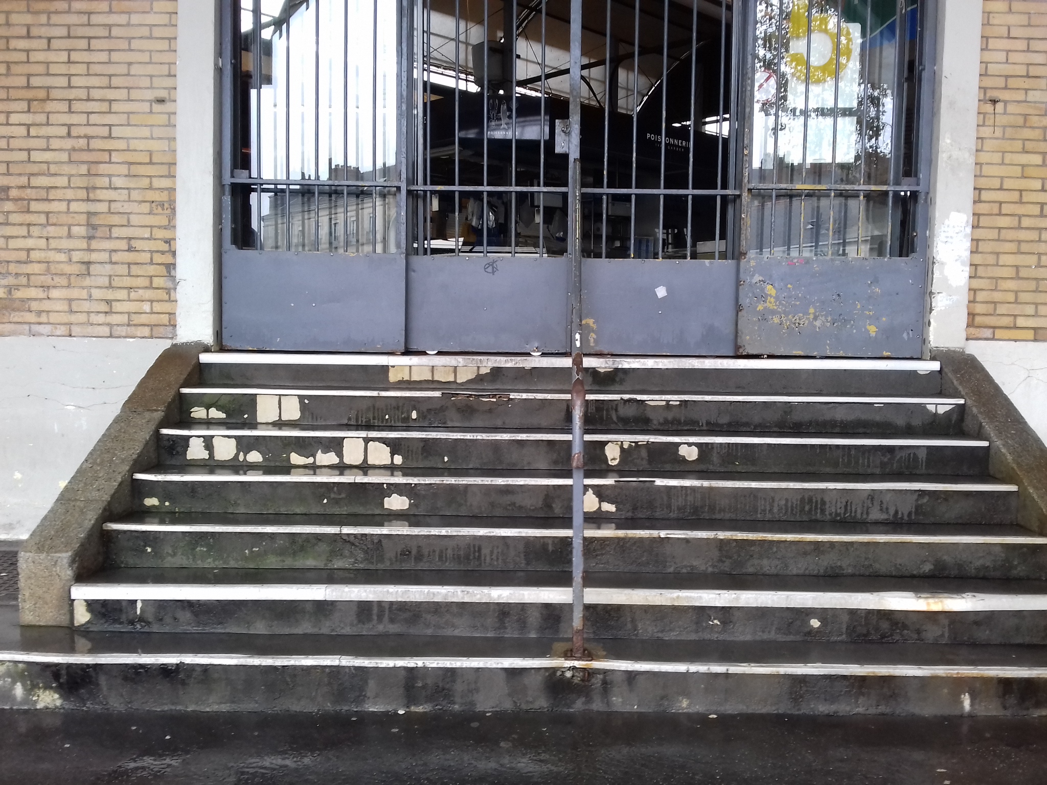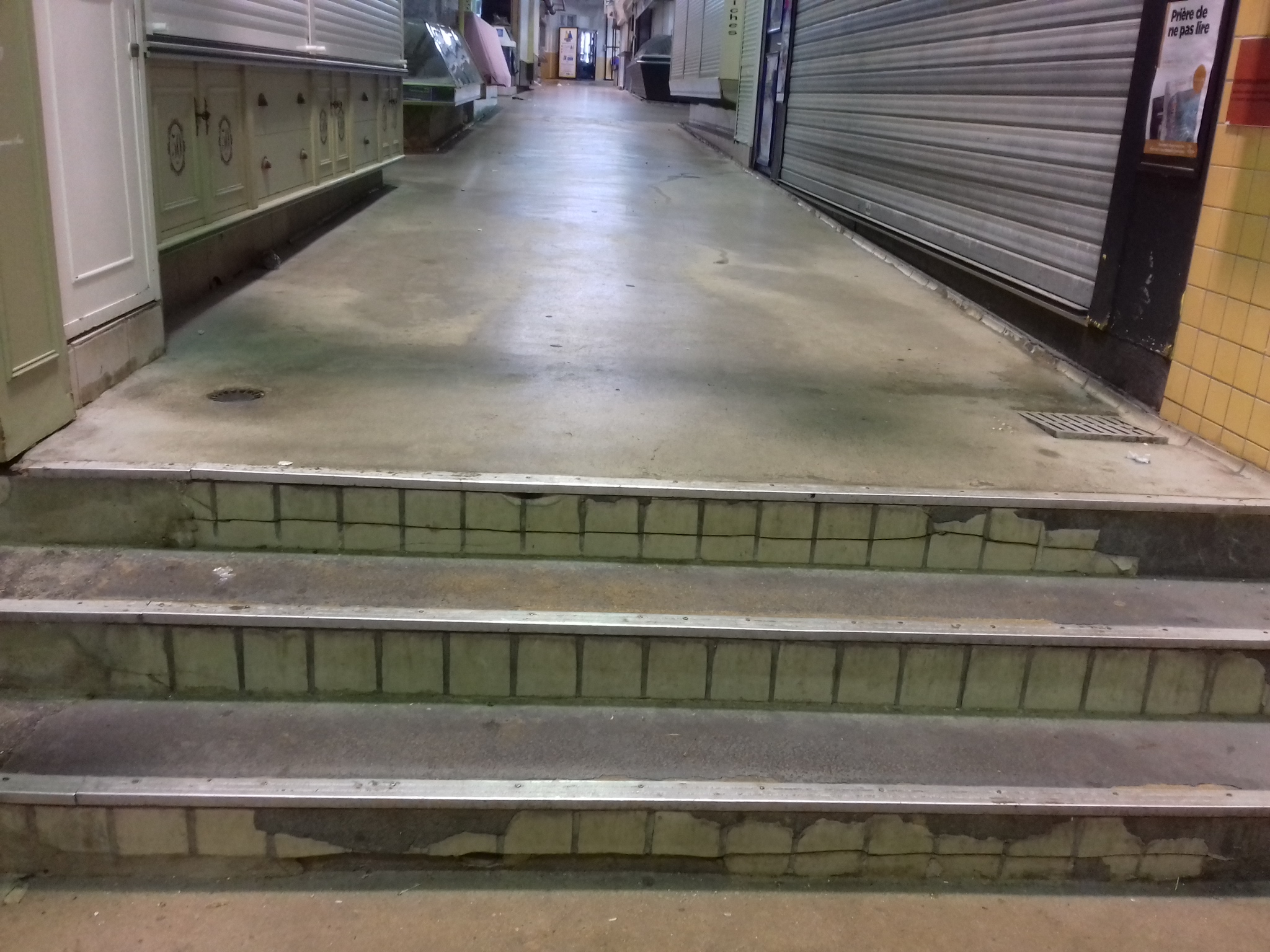 Il y a aussi beaucoup à dire sur le bâtiment du marché, pourtant restauré et mis aux normes en 2003-2004, il y a maintenant un quart de siècle. En bas du marché, face à la ville, le visiteur est accueilli par des marches au carrelage en grande partie écaillé. C’est le cas aussi pour les volées de marches intérieures. Plus haut, un néon tombé pendouille, au niveau d’une porte. Entre les bancs, de la rouille au côté droit d’un extincteur.