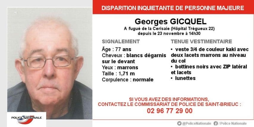 Georges Gicquel, âgé de 77 ans, a disparu samedi 23 novembre 2019 à Trégueux. Les policiers de Saint-Brieuc ont lancé mardi 26 novembre, un avis pour disparition inquiétante le concernant.