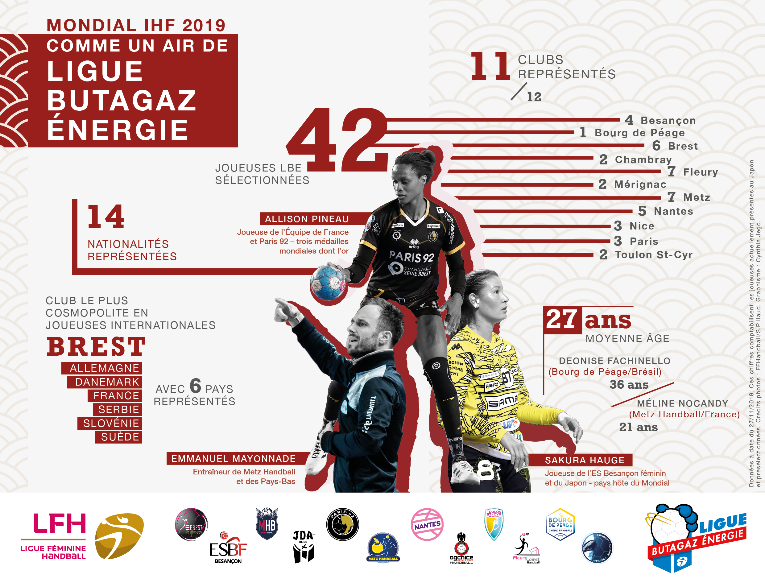 11 des 12 clubs du championnat de France seront représentés au Japon par au moins l’une de leurs joueuses. Fleury (7), Metz (7) et Brest (6) seront présents en force à Kumamoto, avec notamment un panel d’internationales large pour le BBH, représenté par six nations différentes (Allemagne, Danemark, France, Serbie, Slovénie, Suède). Preuve de l’homogénéité de la Ligue Butagaz Énergie, Nantes comptera cinq internationales au Japon, Besançon quatre, Nice et Paris trois, Chambray, Mérignac et Toulon Saint-Cyr deux, et une pour Bourg de Péage (sous réserve des compositions des dernières listes officielles communiquées le vendredi 29 novembre).