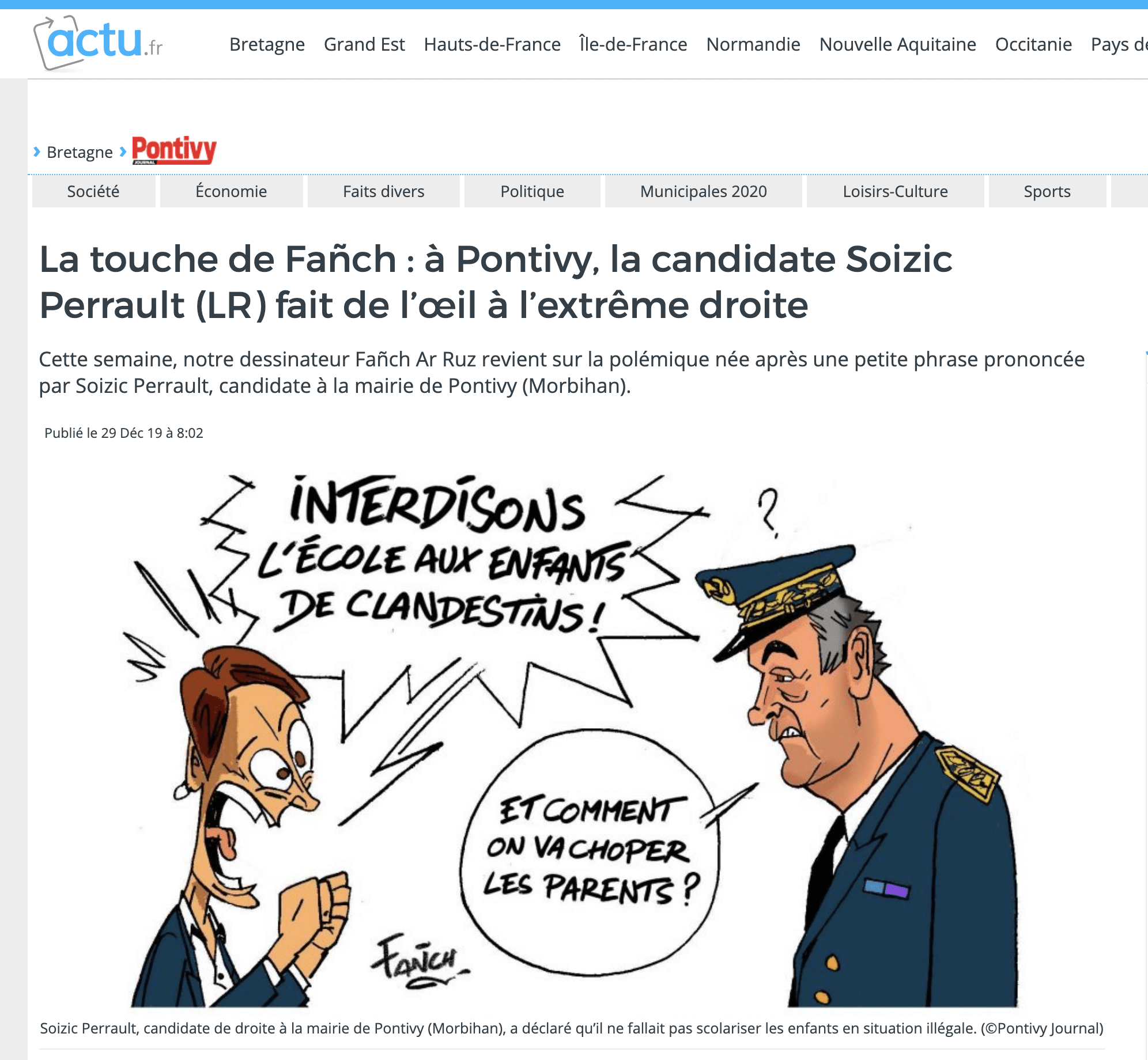 « A Pontivy, la candidate Soizic Perrault (LR) fait de l’œil à l’extrême droite » titre Pontivy Journal la semaine dernière. En cause, une petite polémique, ultra locale, sur des déclarations d’une candidate à la mairie de Pontivy, Soizic Perrault, accusée par le journal, et par la maire sortante, Christine Le Strat, de vouloir récupérer les voix de l’extrême droite.