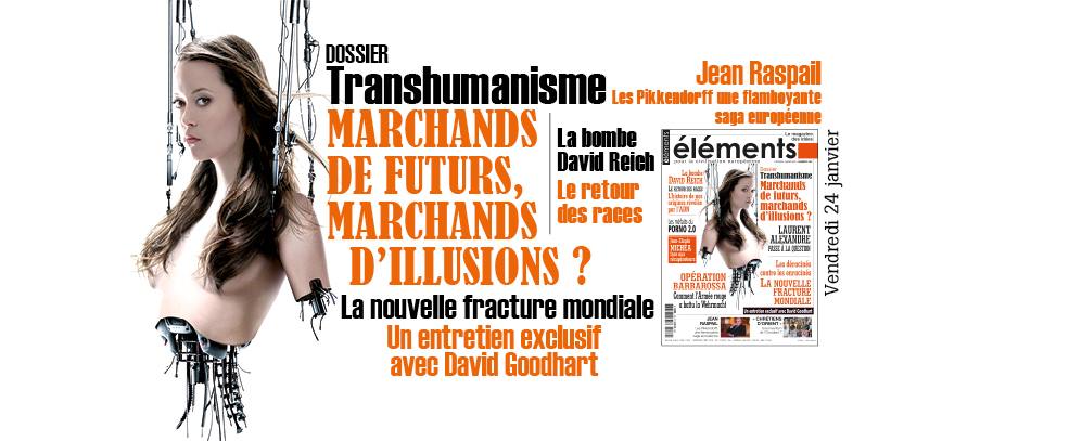 Transhumanisme, marchands de futurs, marchands d’illusions ? Le n°182 de la revue Éléments vient de paraître, chez tous les bons marchands de journaux. En voici le sommaire (et si vous voulez vraiment soutenir cette revue, abonnez-vous, ici).