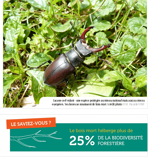 Un organisme saproxylique dépend, pendant une partie de son cycle de vie, d’arbre moribond ou mort, debout ou à terre, ou de la présence d’autres organismes saproxyliques comme les champignons. Les insectes notamment décomposent le bois pour le transformer en humus. Humus qui enrichira le sol, qui à son tour nourrira les arbres… Afin de garantir la conservation des espèces de faune et de flore dépendant des vieux peuplements, l’ONF met en place progressivement des îlots de vieux bois (îlots de sénescence et/ou de vieillissement). L’ONF souhaiterait à long terme que ces îlots représentent a minima 3 % de la surface des peuplements forestiers dans les forêts domaniales. Autre action majeure inscrite au cœur de la gestion forestière : la conservation de 3 arbres bio (1 arbre mort et 2 arbres sénescents / à cavité / champignonnés) à l’hectare, qu’il soit à terre ou sur pied. Indispensable à la vie de nombreux insectes, champignons et oiseaux, qui y trouvent logis et nourriture, ces bois mort abritent en effet près de 25 % de la biodiversité forestière.