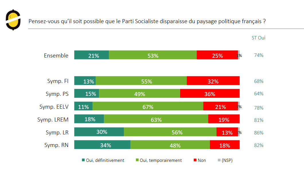 Un sondage réalisé par Odoxa et dont les résultats ont été publiés le 13 février indique que 66 % des personnes interrogées ont une opinion négative du PS. Si le parti a une mauvaise image, les réponses ne sont guère plus flatteuses quant à sa longévité. Pour 74 % des sondés, il n’est pas à exclure que le PS disparaisse du paysage politique français. Les sympathisants de gauche ne font pas davantage preuve d’optimisme que la moyenne : ils sont 71 % à annoncer sa disparition. Enfin, au coeur de l’électorat du parti, 64% des sympathisants socialistes prédisent le même sort à leur formation politique fétiche.