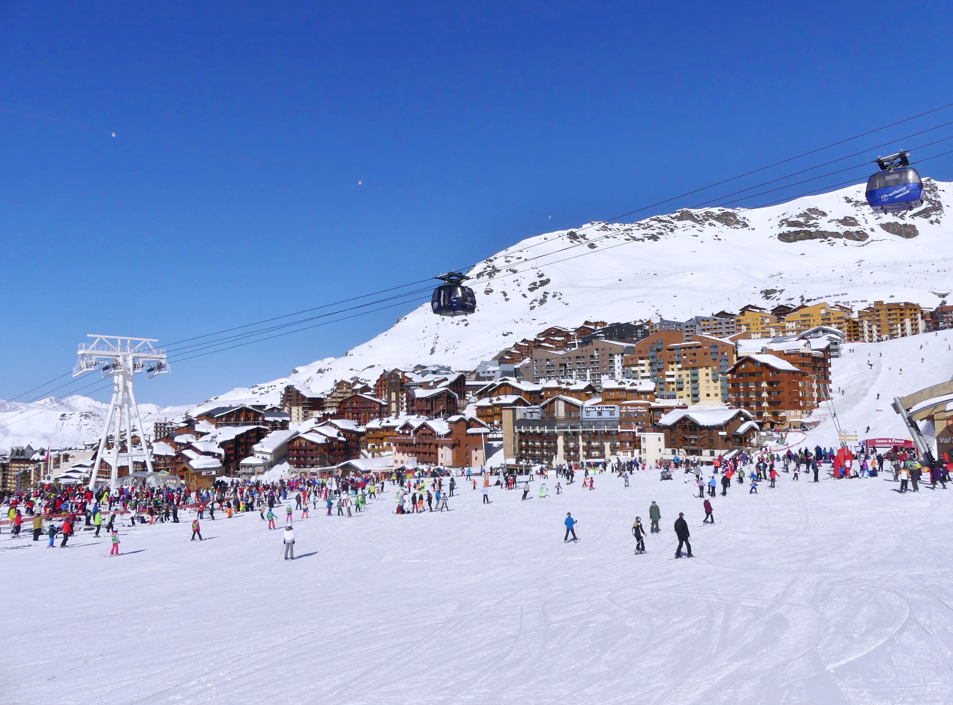 Val Thorens est une station de sports d’hiver de la vallée de la Tarentaise, située sur la commune des Belleville, dans le département de la Savoie en région Auvergne-Rhône-Alpes. Elle fut aménagée en site vierge à partir de 1969 et inaugurée pour la saison hivernale en 1971. Avec un village culminant à 2 300 mètres d’altitude, la station de Val Thorens est la station la plus haute d’Europe, bien que son altitude maximale de 3 230 m soit moindre que l’altitude maximale de 3 880 m de la station de Zermatt en Suisse. La station appartient au domaine skiable des 3 Vallées.
