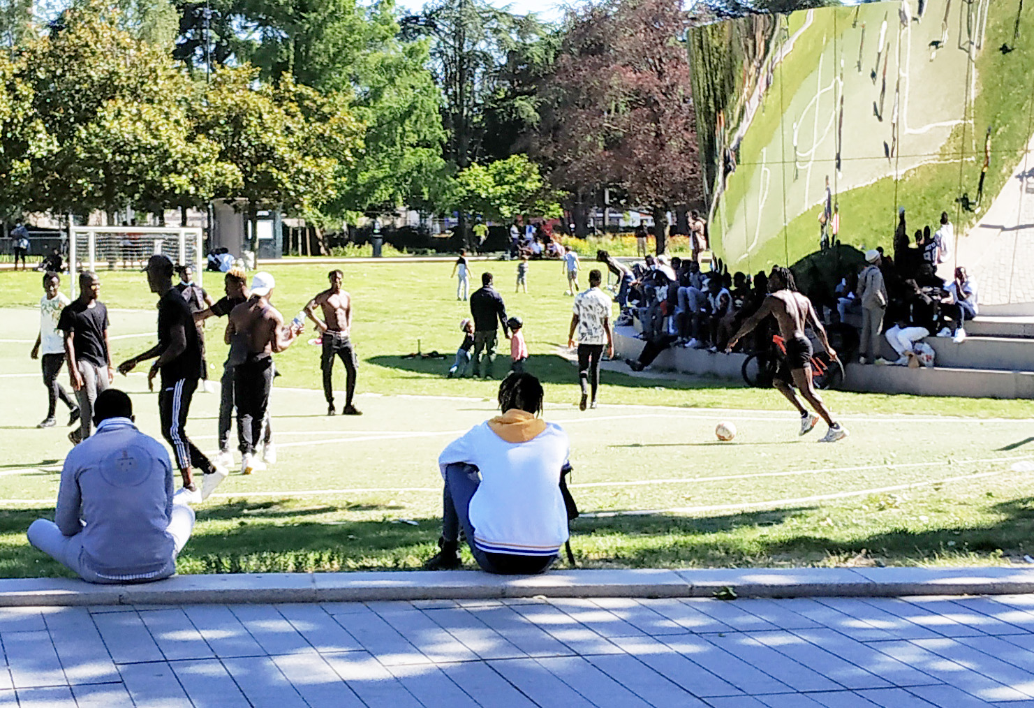 En fait d’enfants, le Feydball est presque exclusivement utilisé par des jeunes d’origine africaine. Aujourd’hui, ce n’est pas seulement une enclave communautaire de fait, c’est aussi une vraie zone de non-droit. Distanciation sociale ? Les jeux de balle sont l’occasion de contacts virils entre joueurs non masqués. Interdiction de rassemblements de plus de 10 personnes ? Au moins une vingtaine de spectateurs s’agglutinent à l’ombre sur la droite.