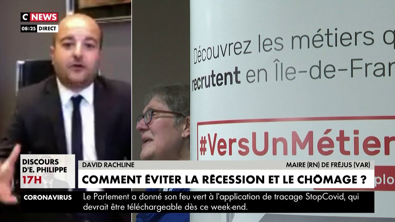 David Rachline, maire Rassemblement national de Fréjus, était l’invité de #LaMatinale sur CNEWS. Il a notamment évoqué les pistes pour éviter la récession économique et le chômage de masse, demandant à l’Etat de trouver des solutions pour permettre aux collectivités locales d’avantager les entreprises françaises.