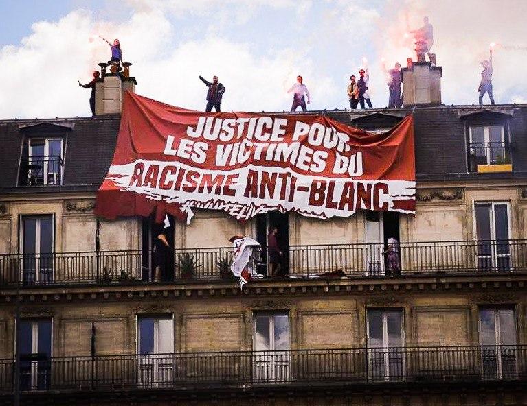Nous avons donc déployé une banderole géante sur la façade d’un immeuble pendant le rassemblement. Elle portait l’inscription « Justice pour les victimes du racisme anti-blanc WhiteLivesMatter ».