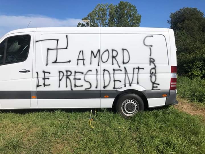 En vacances à Dinard, Anthony Dubois, le président de l’association de défense des cirques de France, a retrouvé une inscription (avec faute d’orthographe) et une croix gammée (à l’envers) sur sa voiture alors que son véhicule était stationné sur le terrain des gens du voyage.