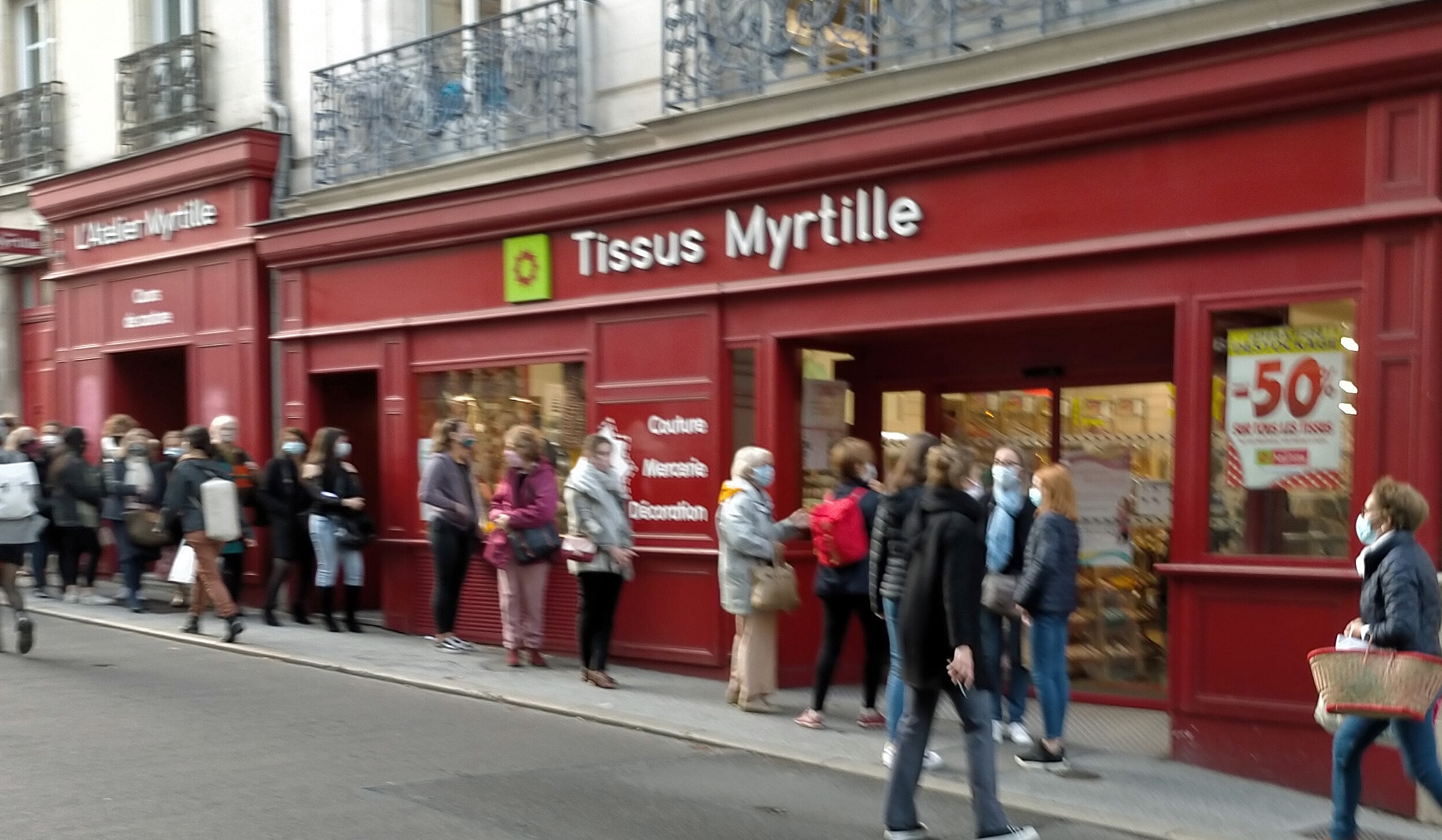 Chez les coiffeurs, les ciseaux s’agitent. Parmi les établissements les plus fréquentés cet après-midi, on note aussi La Poste, les opérateurs de téléphonie mobile, les bureaux de tabac, les établissements de vapotage. Rue Santeuil, une file s’est formée à la porte du magasin Nespresso. De même rue du Calvaire devant les tissus Myrtille : de quoi produire des masques artisanaux en gros ?
