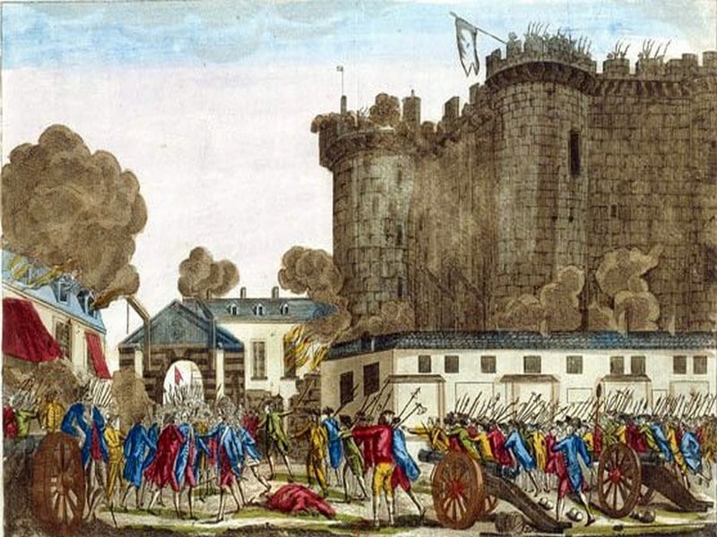 14 juillet 1789 ; assaillie par la populace, bien manipulée, la forteresse de La Bastille se rend aux assaillants sur ordre du gouverneur M. de Launay. La foule, reconnaissante, laisse le boucher Jourdan (ou Desnot) lui couper la tête avec son couteau ; elle est mise au bout d’une pique ainsi que, quelques instants plus tard, celle de Jacques de Flesselles et quelques autres. Les assaillants ont eu une centaine de morts. La forteresse, mise à sac, sera détruite.
