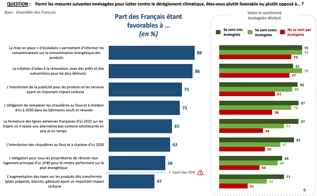 Parmi les autres propositions de la Convention citoyenne, les mesures les plus incitatives recueillent le soutien d’une large majorité de Français, que ce soit la création d’un « écolabel » informatif (88%), la création d’aides à la rénovation en direction des plus démunis (86%) ou encore l’obligation de remplacer les chaudières à fioul et à charbon d’ici à 2030 dans les bâtiments neufs et rénovés (73%).
