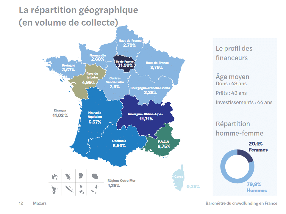 Concernant le profil des donateurs et des prêteurs, leur âge moyen est de 43 ans quand celui des investisseurs est de 44 ans. Sur l’ensemble des fonds collectés, on notera également que la contribution des hommes est évaluée à 79,9 %.