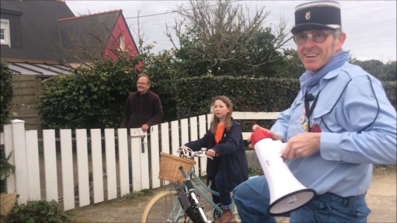 Comme tous les soirs depuis le 16 janvier, Jean-Luc la Police, alias Éric Hervé, sillonne, à vélo, les rues du village finistérien pour annoncer l’imminence du couvre-feu, en ces temps de crise sanitaire liée à la pandémie de coronavirus Covid-19. Vêtu d’un uniforme de faux gendarme. «Il va faire tout noir» crie-t-il dans son mégaphone. «Ta gueule !», lui rétorquent les habitants, à l’instar de ceux qui, également à vélo, l’accompagnent dans son périple quotidien.