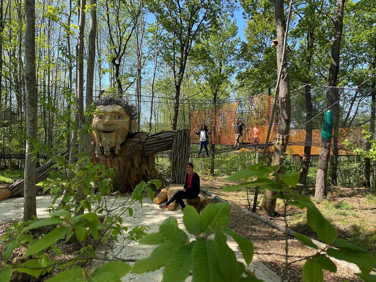 ▪ Une zone de 7 000 m2 au milieu d’une forêt de 20 hectares ▪ 3 géants de 4 mètres de hauteur avec une structure en bois recyclé… ▪ 5 mers de filets représentant plus de 200 m2 de surface et près de 180 mètres de passerelles ▪ Ormes, chênes, peupliers noirs… : 35 arbres ont été plantés à l’orée de ce nouvel univers. Ce sont des espèces locales menacées par le réchauffement climatique.