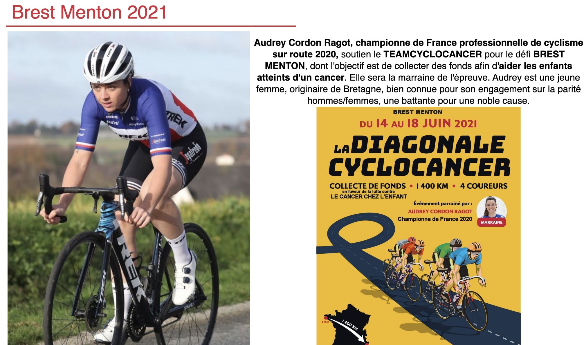 4 coureurs amateurs rallieront Brest à Menton, 1 400 kilomètres, 10 000 D+, en 110 heures. Une aventure au long cours pour sensibiliser le Grand Public sur le cancer chez l’enfant, organiser une collecte de dons, sous les couleurs de la CycloCancer. Ils le feront sous les couleurs de la Teamcyclocancer.com, soutenu par Audrey Cordon Ragot, la championne cycliste.