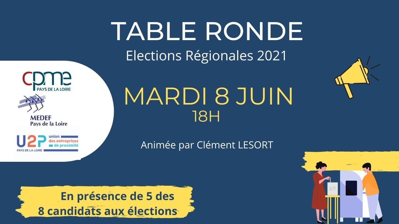 Les MEDEF, CPME et U2P régionaux organisent conjointement, ce 8 juin 2021, à 18h00, une table ronde qui réunira 5 candidats à la présidence de la Région :  Guillaume GAROT (PS)  Christelle MORANCAIS (LR)  Hervé JUVIN (RN)  François DE RUGY (LREM)  Mathieu ORPHELIN (EELV)