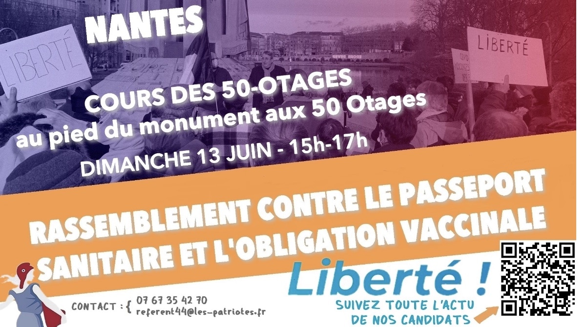 A l’initiative de la section de la Loire-Atlantique des Patriotes, le mouvement présidé par Florian Philippot, se tiendra, ce dimanche 13 juin, à partir de 15 heures, place du Pont-Morand, à Nantes, un rassemblement contre le Pass sanitaire et la politique vaccinale du gouvernement.