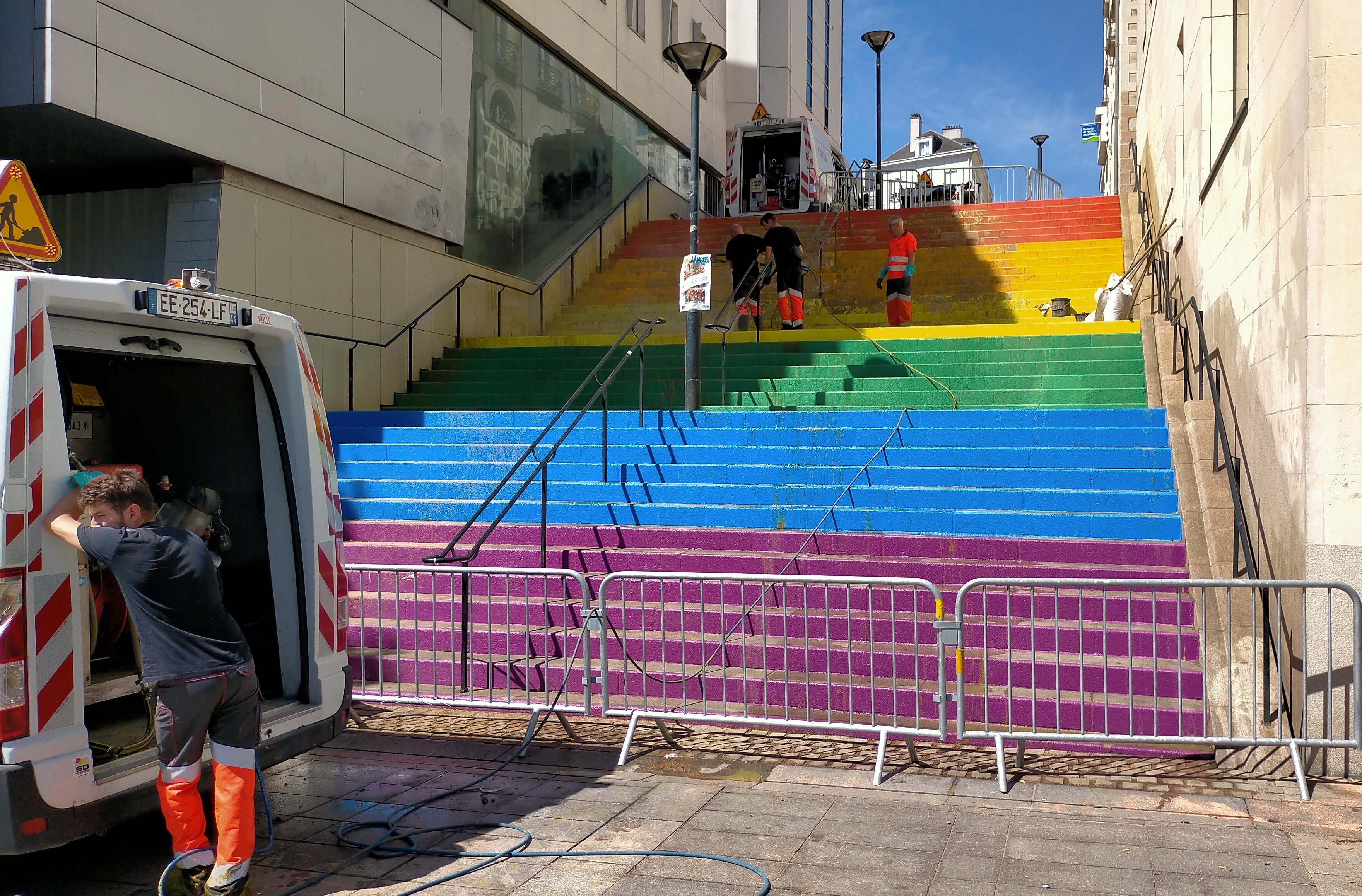 Le gag récurrent a cessé de faire rire : une fois de plus, l’escalier qui descend de la rue Beaurepaire au cours des 50 otages, en plein centre de Nantes, a fait l’objet ce week-end d’une escarmouche à coups de pots de peinture. En 2018, l’association Nosig a jeté son dévolu sur ce grand escalier de granit. Elle l’a peint aux couleurs du drapeau arc-en-ciel, vieil étendard pacifiste soumis à une OPA du mouvement homosexuel depuis une quarantaine d’années. Quelques jours plus tard, la peinture avait été irrémédiablement dégradée par des inconnus.