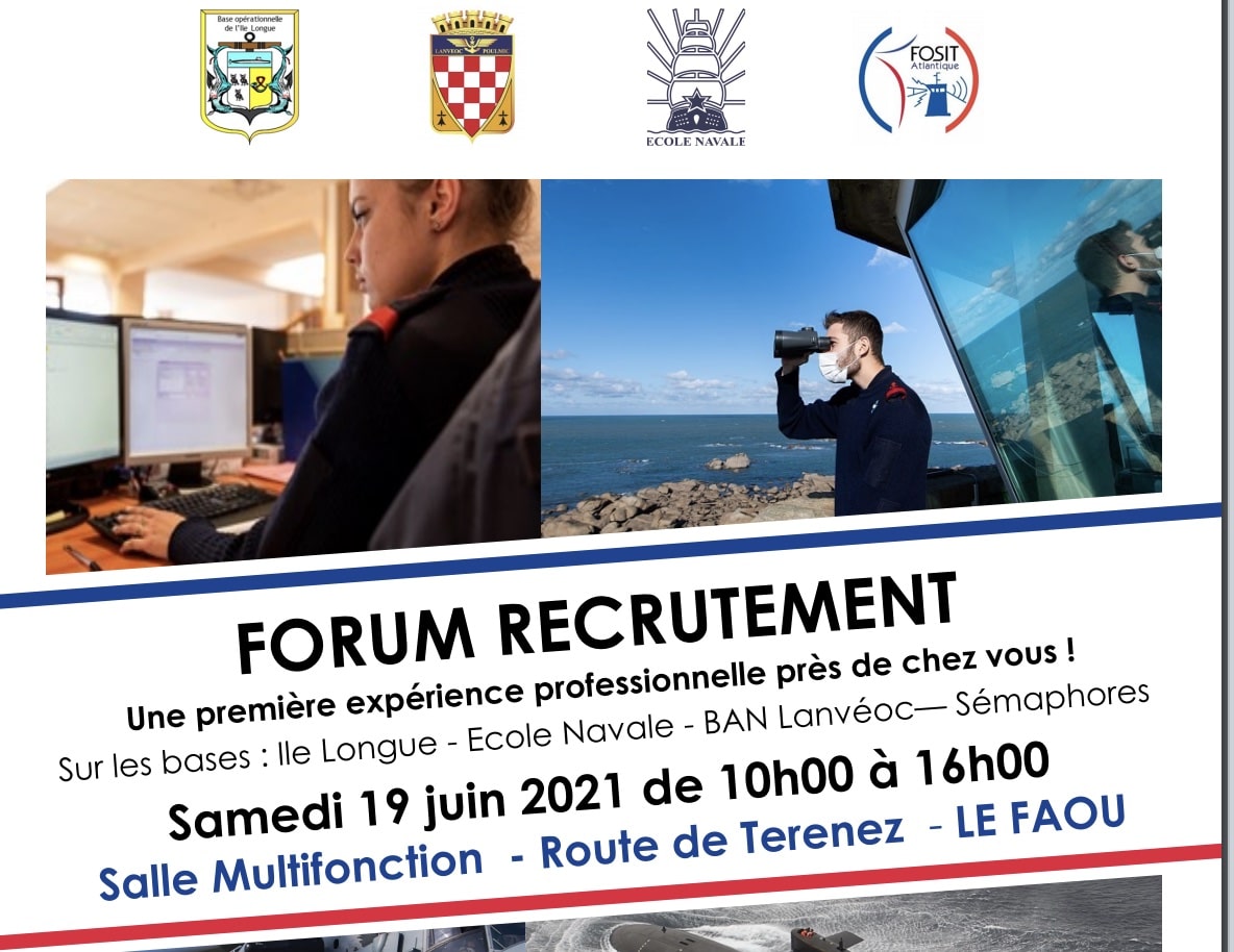 Le samedi 19 juin, à la salle multifonction du Faou (29), de 10h00 à 16h00, les bases de l’île longue et de Lanvéoc-Poulmic, l’école navale et les sémaphores du Finistère présenteront 150 offres d’emploi aux jeunes de 17 à 30 ans du département.