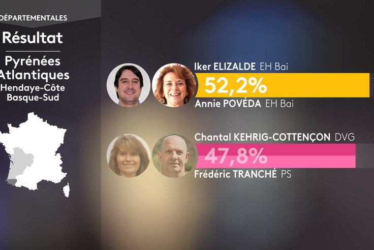 D’an dro gentañ o doa graet berzh an abertzale e Bro-Euskadi dija met d’an eil tro o deus cheñchet penn d’ar vazh : Aet eo kanton Hendaye gant EH Bai, ar strollad broadelour eus an tu-kleiz. 52,88% eus ar mouezhioù a zo bet rastellaet gant Iker Elizalde hag Annie Poveda.