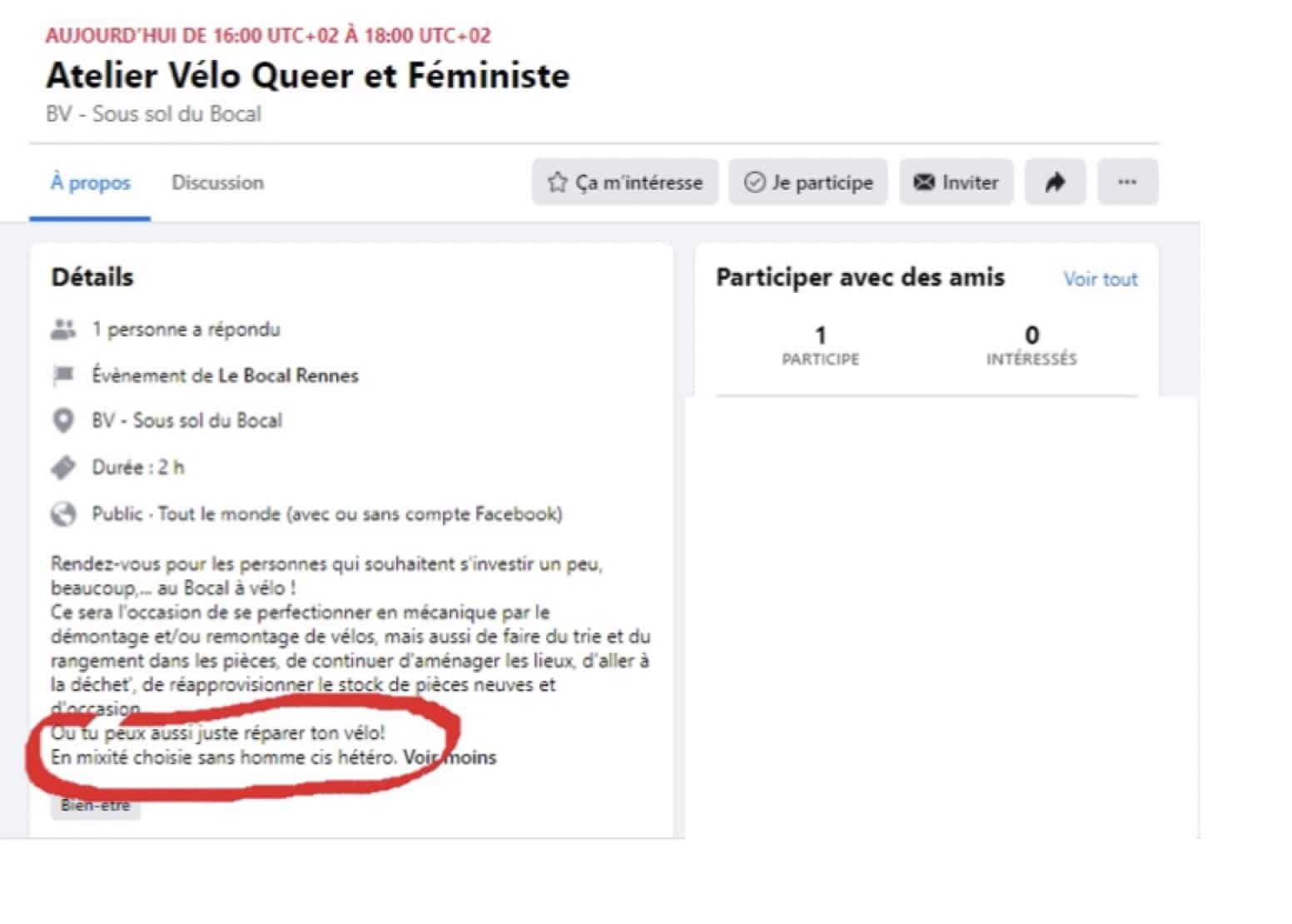 Toutes les semaines, le Bocal organise des « ateliers vélos Queer et féministes » dans lequel, selon leur page Facebook, il n’y a pas grand monde. Il faut dire que l’atelier en question est en « mixité choisie, sans homme cis hétéro ». En clair, sans hommes normaux. En même temps, quel homme normal aurait envie de mettre les pieds dans un poulailler pareil ?