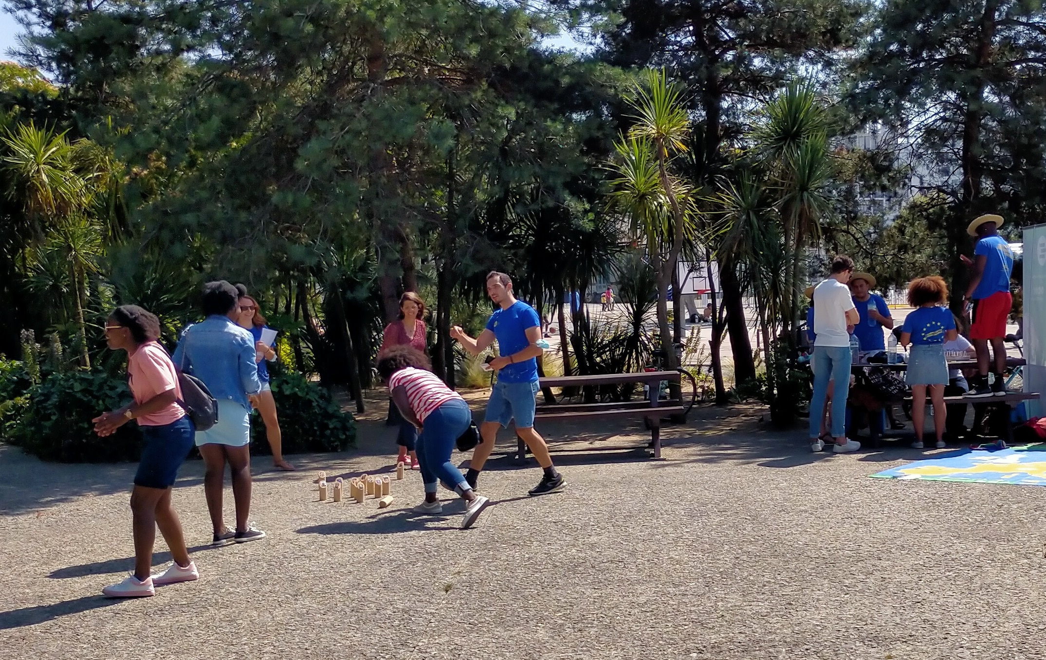 Les Jeunes Européens s’étaient installés à Nantes près des Machines de l’île ce week-end. Ils tentaient d’attirer le chaland avec des amusements élémentaires (reconnaître les pays de l’Union européenne sur une carte, etc.). Ils n’ont rencontré qu’un succès modeste. Le Grand éléphant et la caravane du Kenleur Tour installée à proximité leur ont fait de l’ombre.