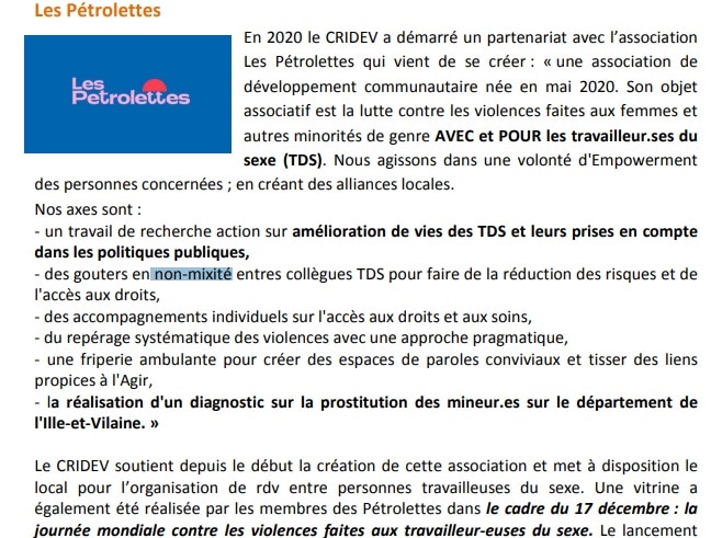Cela conduit notamment cette association ultra-subventionnée (27% des subventions viennent de la ville de Rennes, 25,3% de l’Etat, 16% du Conseil Départemental 35 et 17% d’autres sources) à pratiquer les réunions non-mixtes, système discriminatoire pourtant largement condamné depuis la dernière affaire UNEF en date. Ainsi dans son rapport moral 2020, le CRIDEV indique qu’il organise des « gouters (sic) en non-mixité entre collègues TDS (lire : Travailleuses du Sexe = prostitués et autres) (…)»