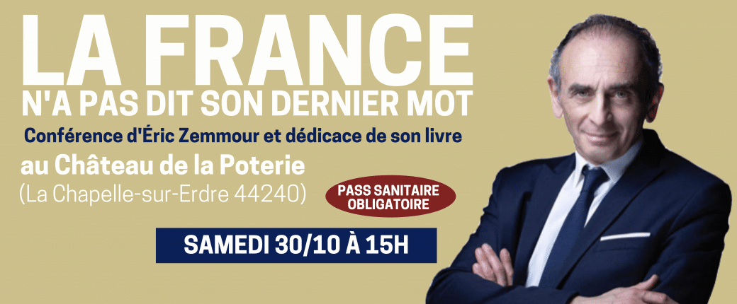 Éric Zemmour, outre un passage à Pleurtuit le vendredi 29 octobre à l’espace Delta, sera en conférence et dédicace de son dernier livre « La France n’a pas dit son dernier mot » le samedi 30 octobre à 15h au Château de la Poterie à LA CHAPELLE-SUR-ERDRE (44240).