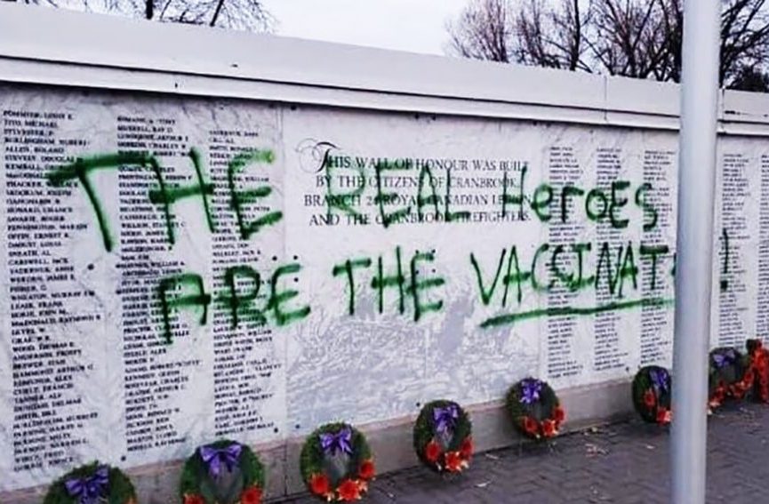 En Colombie Britannique, province la plus à l’ouest du Canada, un monument aux anciens combattants a été vandalisé dans la ville de Cranbrook par un graffiti d’un genre nouveau puisque faisant l’éloge de la vaccination contre le Covid-19. « Les vrais héros sont les vaccinés », pouvait-on lire en peinture verte sur l’édifice, dégradé avant que la ville ne célèbre ses vétérans pour le jour du Souvenir, jeudi 11 novembre.