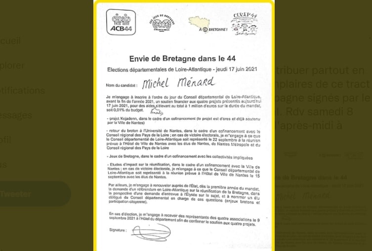 Prometaet e oa bet traoù, pa oa war ar renk, gant Michel Ménard, prezidant an departamant Liger-Atlantel, a oa sañset kas àr-raok ar c’henober etre al Liger Atlantel hag ar pevar departamant breizhad all. E-touez ar promesaoù : ur referendom war an Adunvanidigezh. Met bremañ, petra zo bet graet gantañ ? Petra zo bet kaset da wir ? Pas kalz traoù siwazh…