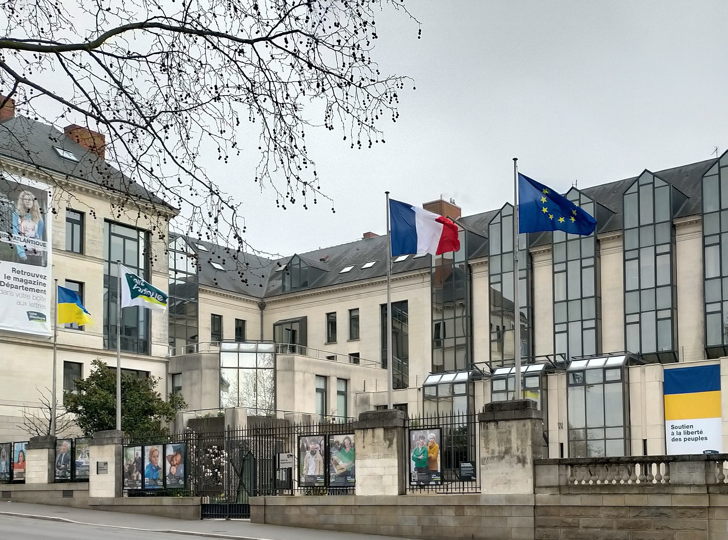 Le Gwenn-ha-du flottait devant l’hôtel du département de Loire-Atlantique avant qu’on lui substitue le drapeau ukrainien