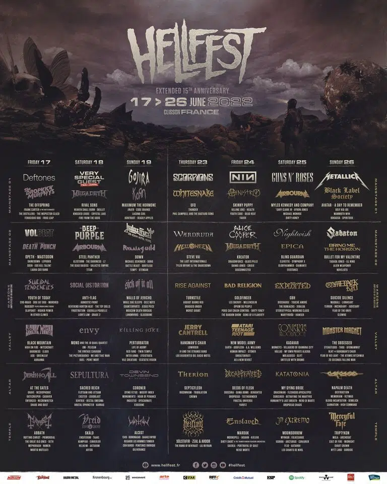 Puis direction à nouveau le site de Clisson du jeudi 23 au dimanche 26 juin 2022 avec Metallica mais aussi Nine Inch Nails, Scorpions ou encore Guns N’Roses, Alice Cooper, Avatar…
