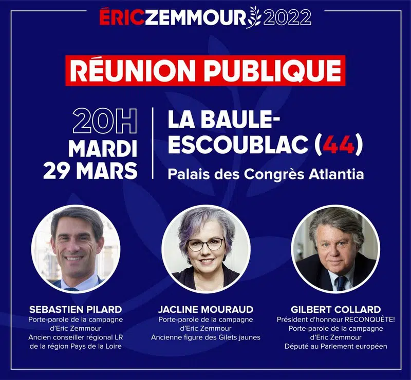 Une réunion publique en soutien à la candidature d’Éric Zemmour se tendra à La Baule le mardi 29 mars à 20 heures, au palais des congrès Atlantia. Sébastien Pilard, porte-parole du candidat, ancien conseiller régional LR des Pays de la Loire, Gilbert Collard, député européen et Jacline Mouraud, ancienne figure des Gilets jaunes, y prendront la parole.