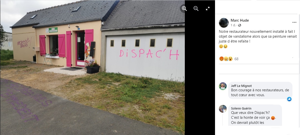 Digoret e oa bet d’an 12 a viz ebrel, ar preti « Bécassine » e Plounevez-Moedeg e Bro-Dreger a zo bet taget kerkent gant luganioù e brezhoneg « Dispac’h » pe e galleg « Bécassine dehors », « les bécassines t’emmerdent ».