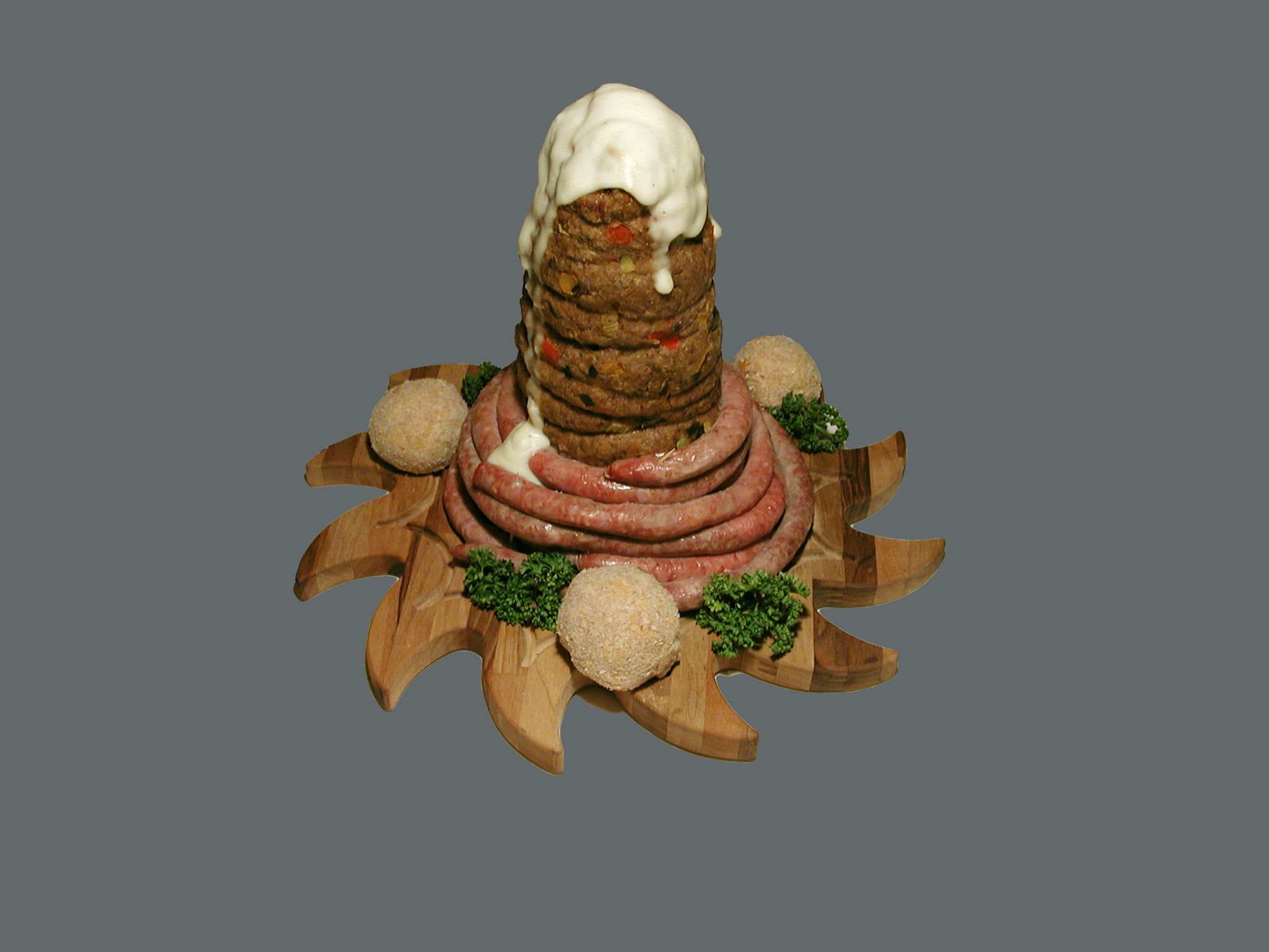 Plat en forme de fuselage d’avion dont les onze légumes rappelle les terroirs de la Péninsule et dont les saucisses et le poulet bouilli sont un hommage au sources paysannes de l’Italie.