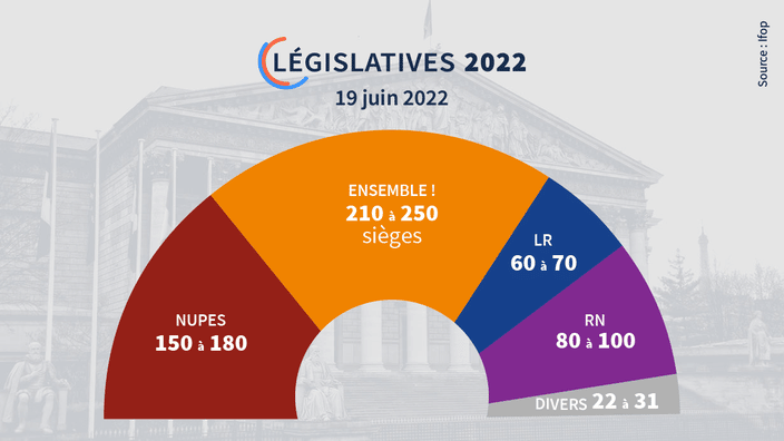 La Nupes (Nouvelle Union populaire écologique et sociale, emmenée par Jean-Luc Mélenchon) décrocherait entre 163 et 203 sièges. Suivent derrière : le Rassemblement national (de Marine Le Pen) avec entre 67 à 90 sièges et Les Républicains et alliés avec 30 à 50 sièges.