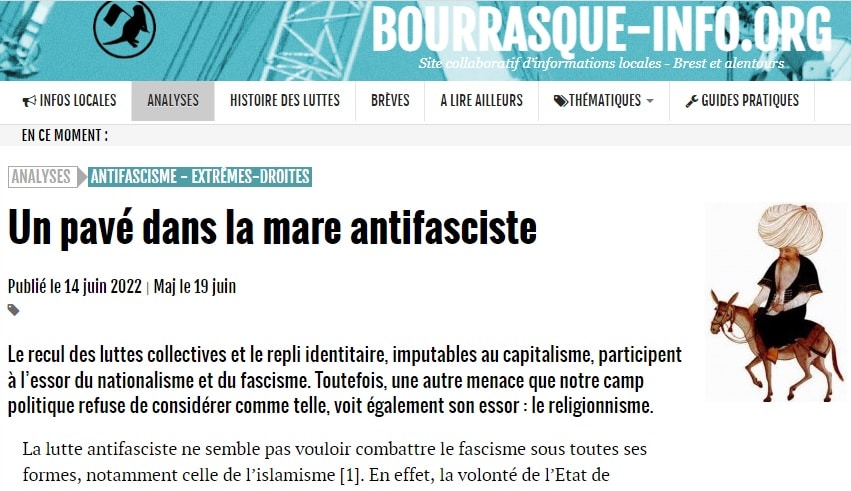 Ha Bourrasque-Info da ziskouezh gant e viz « l’Action Antifasciste Paris-Banlieue » pe « l’Action Antifasciste Nantes » pe ar « GALE » zoken, da lavaret eo genaouien talvoudus muiañ-karet paotred o barv hir. Hervezo e vefe ar strolladoù-se o soutenn strolladoù ha lec’hiennoù islamek ha n’o deus netra da wellet gant o stourm. Poent bras e oa da zigeriñ an daoulagad kamaladed !