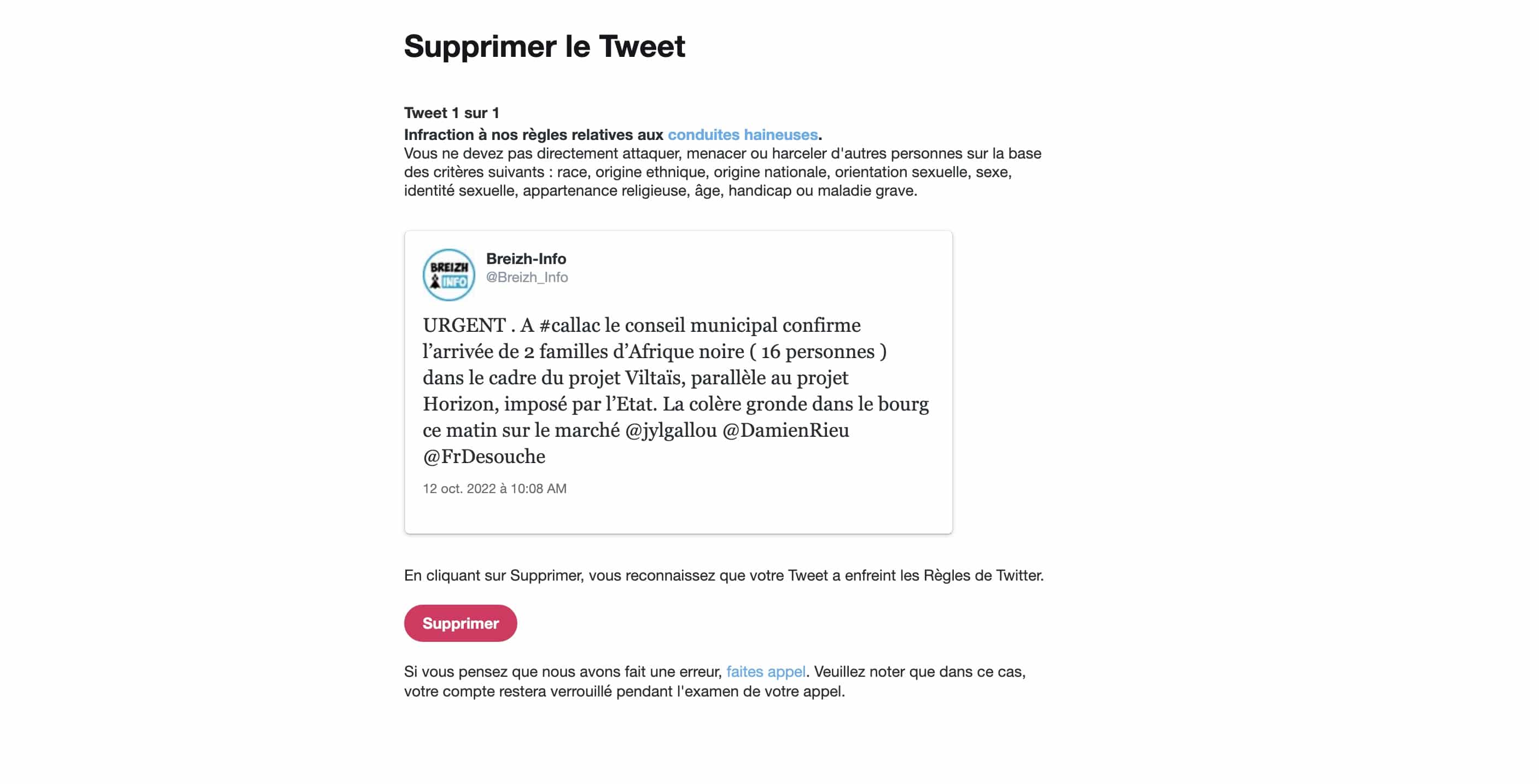 Voici le contenu du tweet posté, le 12 octobre 2022, sur le compte twitter de Breizh-info.com (@Breizh_info). Un tweet qui a valu purement et simplement la suspension du compte, et l’impossibilité temporaire (nous avons fait appel) d’informer nos bientôt 13 200 abonnés.