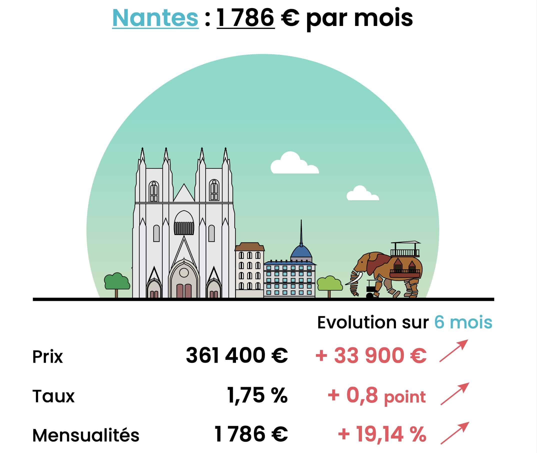 C’est à Nantes que nous notons la plus forte progression du budget mensuel dédié à l’achat immobilier : +19,14%. Cela se traduit par une mensualité à 1 786 € contre 1 499 € au printemps dernier, soit quasiment 300 € de plus. Ensuite, viennent dans l’ordre :