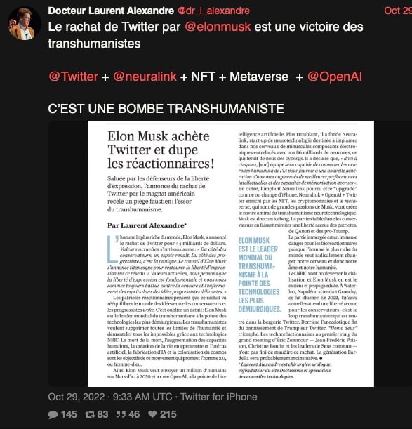 « Le rachat de Twitter par Elon Musk est une victoire des transhumanistes. Twitter + neuralink + NFT + Metaverse + OpenAI C’EST UNE BOMBE TRANSHUMANISTE »Docteur Laurent Alexandre