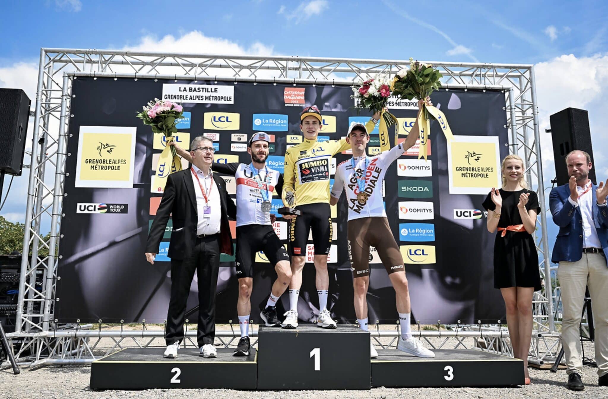 Après avoir remporté deux étapes dans la semaine, le vainqueur du Tour de France 2022 s’impose avec autorité : 2’23’’ d’avance sur son premier poursuivant Adam Yates, déjà 2e en 2018, et 2’56’’ sur Ben O’Connor, 3e comme l’année dernière. La satisfaction de la formation Jumbo-Visma est complétée par le maillot vert que Christophe Laporte a pu porter tout au long de la semaine depuis sa victoire sur la première étape à Chambon-sur-Lac. Le maillot de meilleur jeune revient à Carlos Rodriguez, qui a déshabillé Max Poole du maillot blanc sur l’étape du jour. Le champion d’Espagne, 9e du général, est  également monté sur le podium final avec sa formation Ineos Grenadiers, victorieuse du classement par équipes.