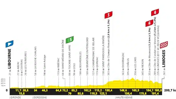 L’étape, longue de 200 kilomètres, va relier Libourne à Limoges avec un tracé favorable aux rouleurs. Si la première partie de l’étape s’annonce très plate et plutôt monotone, le passage au km 123 de Saint-Pardoux-la-Rivière marquera l’arrivée d’un relief accidenté avec un enchaînement de côtes avec, d’abord, la côte de Champs-Romain (2,8 km à 5,2%) d’abord, puis au km 184 la côte de Masmont (1,3 km à 5,5%) avant une dernière difficulté, au km 191, la côte de Condat-sur-Vienne (1,2 km à 5,4%). Un final explosif qui pourrait être très spectaculaire.
