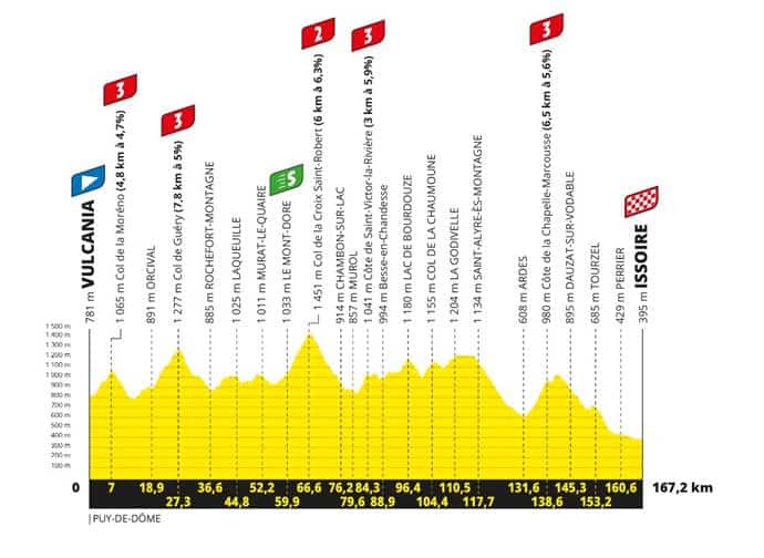 Au programme de l’étape du jour, un parcours de 167,2 kilomètres à parcourir avec un profil de 3.151 mètres de dénivelé positif à grimper. Au total, cinq ascensions répertoriées classées en 3e et 2e catégories comptant pour le classement de meilleur grimpeur. Peu après le départ, au kilomètre 7, les coureurs vont se retrouver au sommet du Col de la Moréno (4,8km à 4,7%). Suivra au kilomètre 27,3 le Col de Guéry (7,8km à 5%) qui s’élève à 1.277 mètres d’altitude. Et c’est au kilomètre 66,6, à 1.451m d’altitude que les coureurs seront au sommet du Col de la Croix-Saint-Robert (6km à 6,3%). Viendra la Côte de Saint-Victor-la-Rivière (3km à 5,9%) et à 30 kilomètres de l’arrivée se dressera la cinquième et dernière ascension répertoriée avec la Côte de la Chapelle-Marcousse (6,5km à 5,6%).